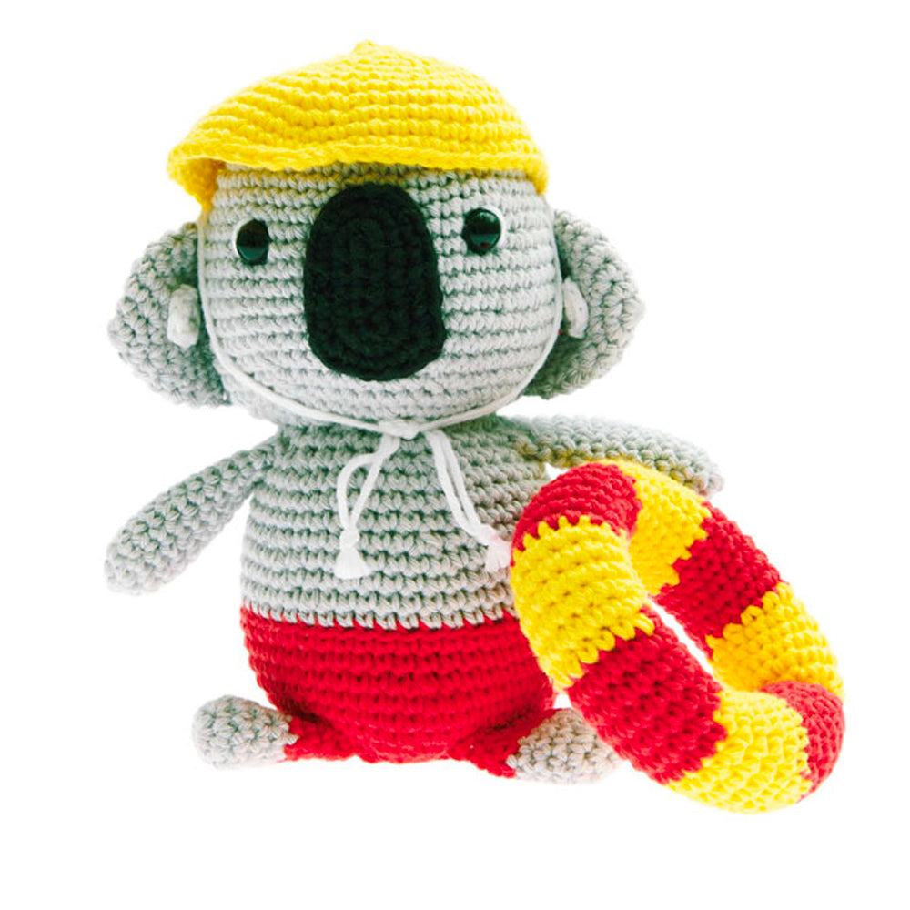 Kevin the Koala kit includes one skein each of (01) White, (06) Yellow, (28) Red, (60) Black and two skeins of (58) Silver Grey), 2.5mm crochet hook, pair of 8.5mm eyes and pattern.